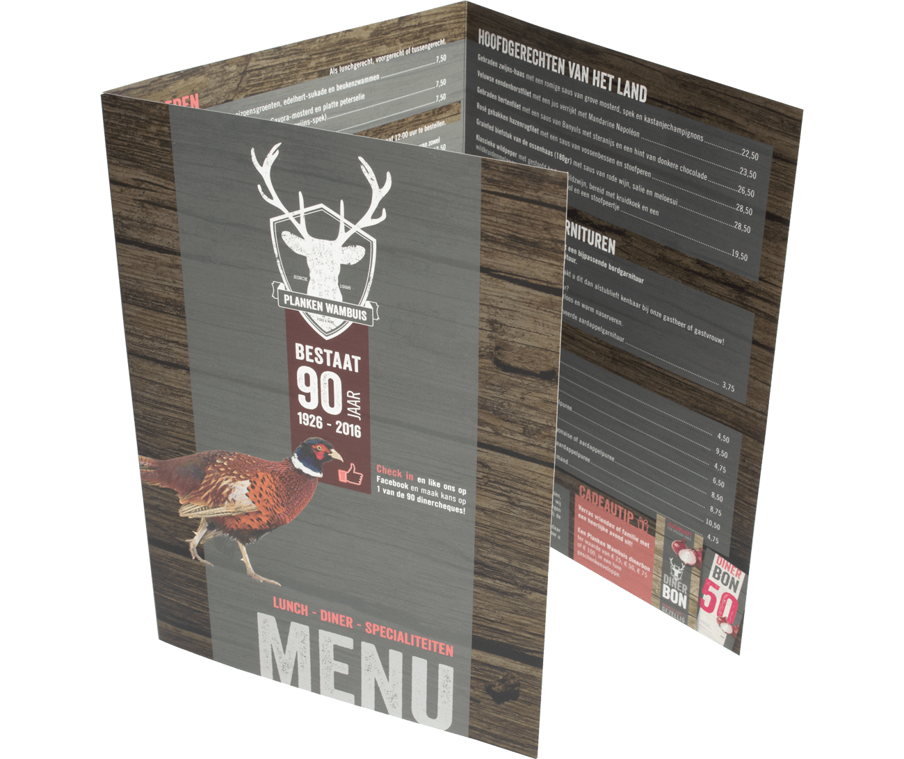 Bij Groenprint laat je professionele afhaalkaarten drukken voor jouw horecaonderneming. De afhaalkaarten zijn te bedrukken op verschillende papiersoorten, waaronder ook gerecycled papier. Om de afhaalkaarten een extra luxe uitstraling te geven kan je kiezen voor glans, mat of krasvast laminaat. Door het gebruik van laminaat zijn de afhaalkaarten gemakkelijk af te doen met een doekje. De gevouwen afhaalkaarten worden voorzien van één of meerdere rillen afhankelijk van de gekozen vouwwijze. De afhaalkaarten worden plano, uitgevouwen geleverd.