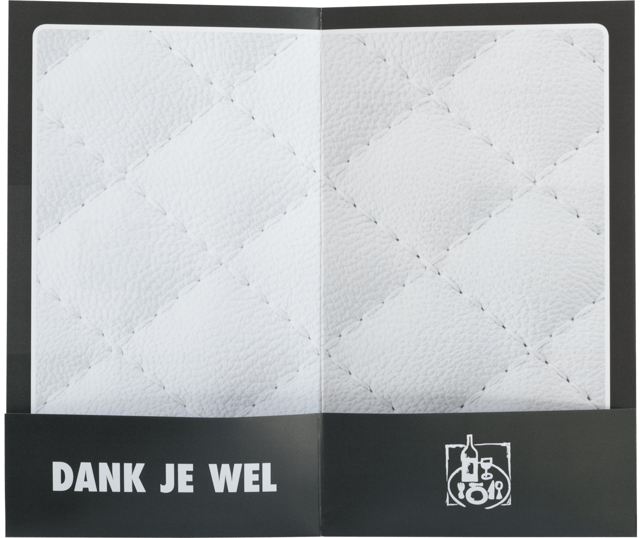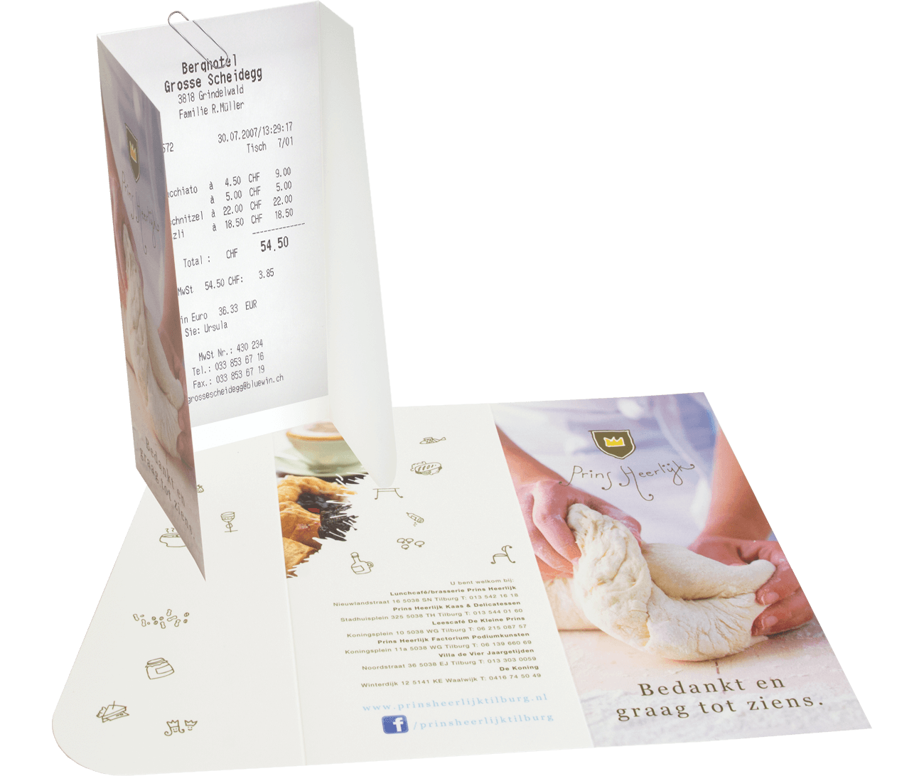 Rekeningmapjes voor in de horecaJe eigen rekeningmapjes drukken in de kleuren van jouw huisstijl. Zo kan je kiezen uit 2 modellen met ieder hun eigen karakteristieke uitstraling. Model 1 (zie voorbeeld rechts) heeft 2 flappen waarvan 1 flap een mooie contour heeft. De rekening kan bijvoorbeeld met een paperclip aan het middenstuk van het rekeningmapje bevestigt worden. Model 2 (zie voorbeeld onder) heeft rechte hoeken en wordt op iets minder dik papier gedrukt dan model 1 om te voorkomen dat het rekeningmapje op gaat staan. De onderste flappen zorgen ervoor dat de rekening netjes ingestoken kan worden. Op een professionele wijze overhandig je de eindafrekening aan je klanten. |