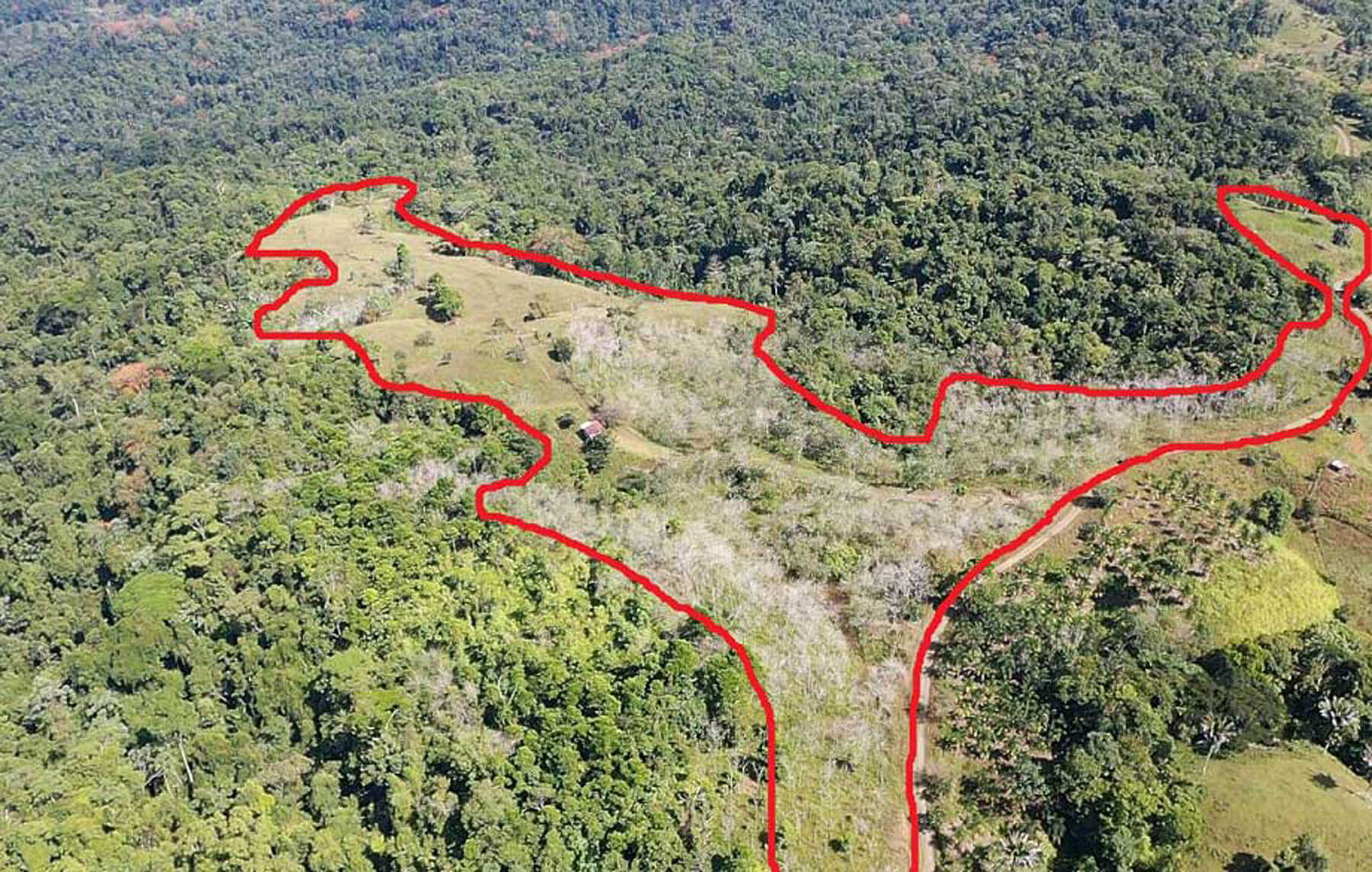 In het weiland binnen de rode lijnen zullen 27.500 bomen werden geplant. (foto: Stichting Adopteer Regenwoud)